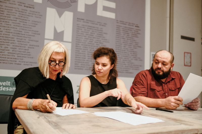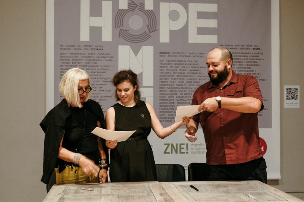 Zwischen der Initiatorin und Kuratorin von HOPE HOME • НАДІЯ Adrienne Goehler, der Architektin und Projektleitung Ukraine, Sofia Galat und Maksym Kashuba, Chef der Militärverwaltung des Bezirks Mykolaiv wurde eine Kooperationsvereinbarung unterzeichnet, in diesem Distrikt beispielhaft am Dorf Pervomaisk zu beginnen mit den natürlichen Baustoffen und zusammen mit Bewohner:innen zu reparieren, zu heilen, neu zu bauen und Lehr- und Lernhäuser zu diesen Materialien zu konzipieren.